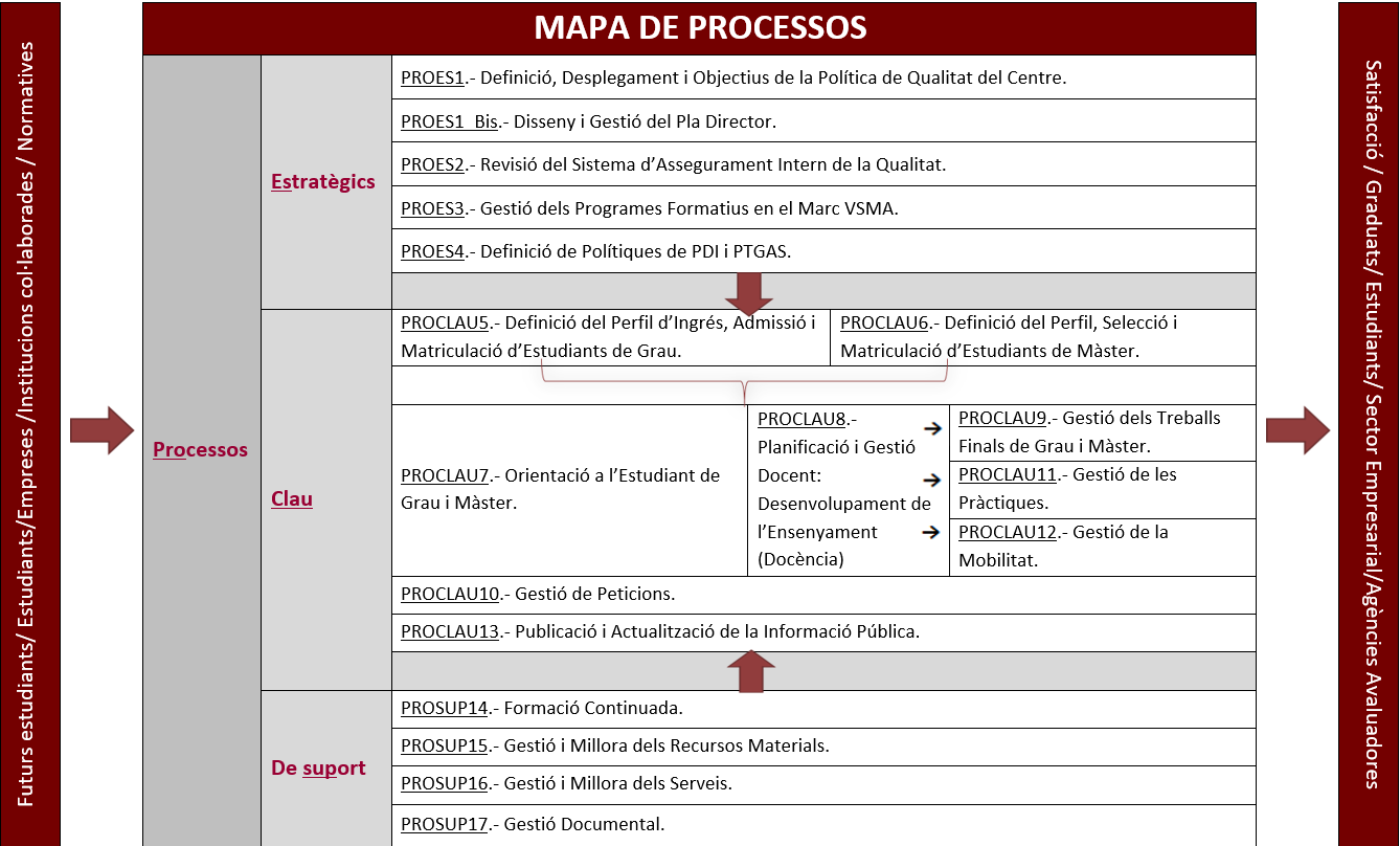 El SAIQU de la Escola incluye todos los procesos que gestionan el sistema de calidad y que definen su alcance. Estos procesos específicos de calidad (PRO) describen las acciones relevantes para la mejora continua de las enseñanzas.